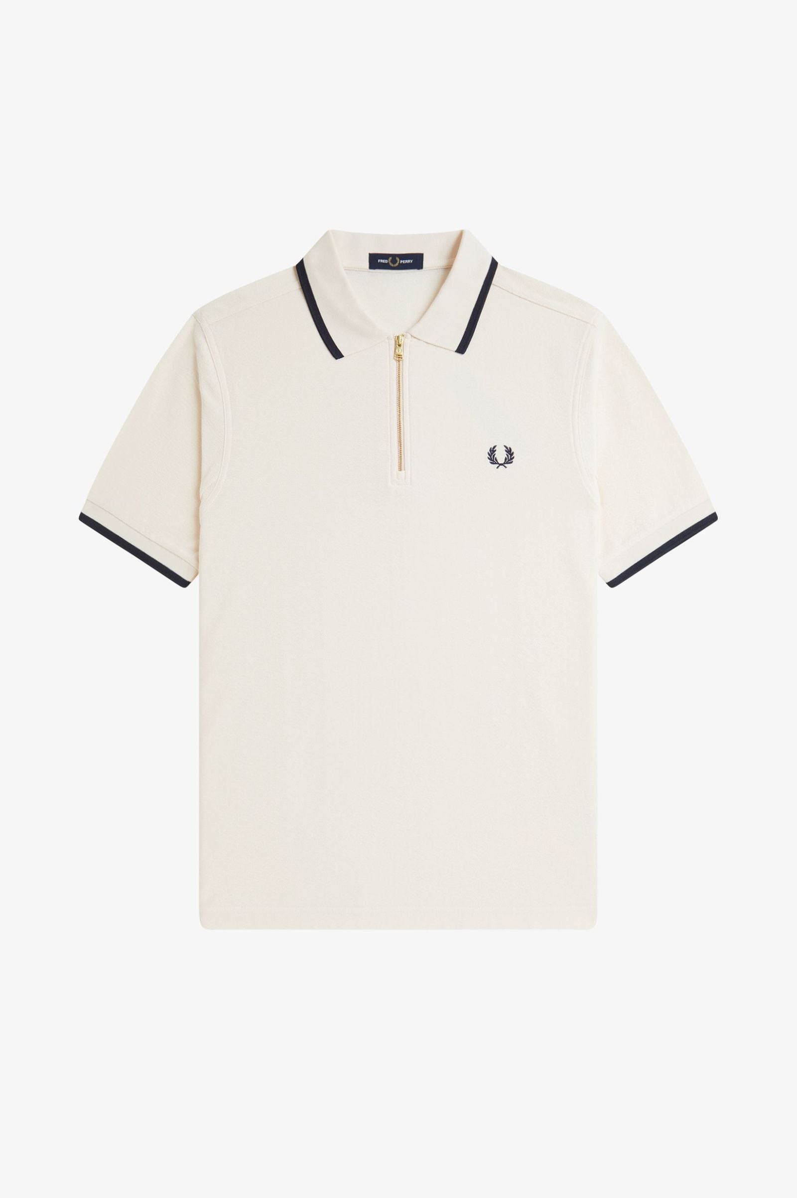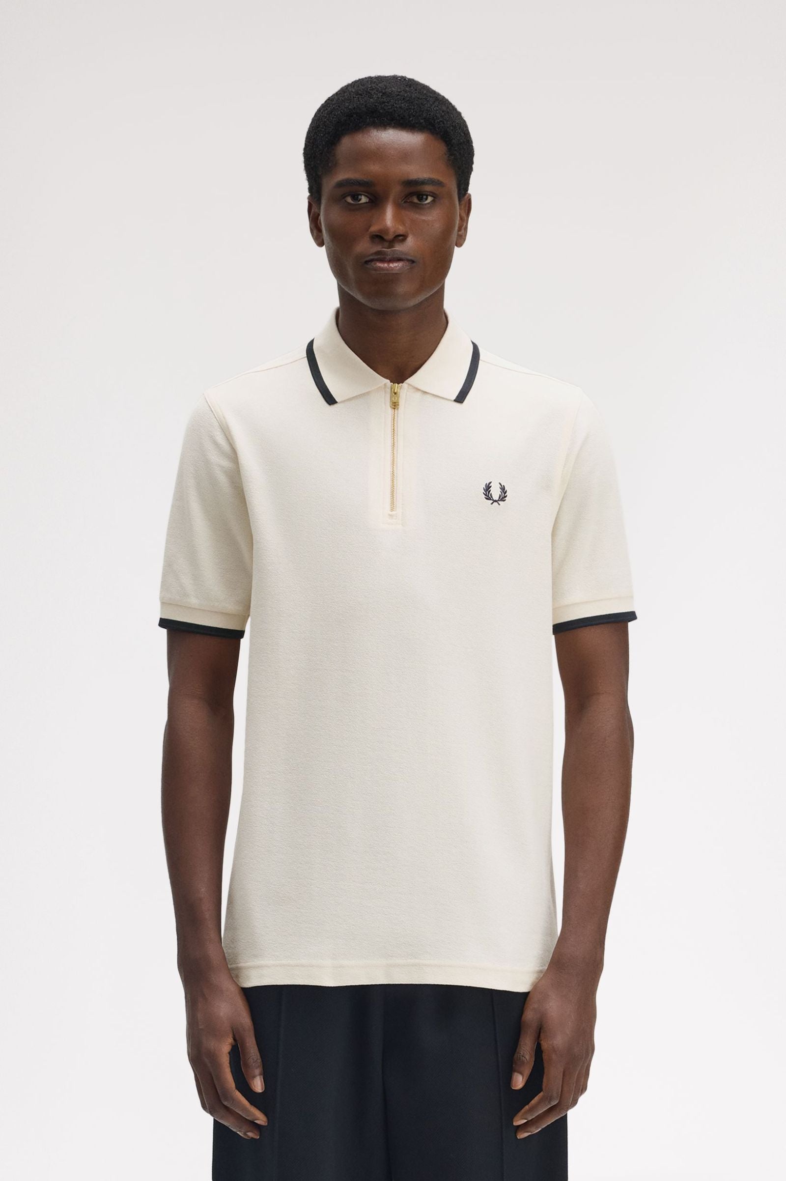 This refined polo shirt combines classic tailoring with contemporary sophistication. Crafted from crepe cotton piqué, it delivers a distinctive textured finish with subtle visual depth. The regular fit ensures versatile styling, while the branded metal zip adds a premium touch with its polished gold-tone hardware. Signature tipped detailing frames the collar and cuffs for a refined aesthetic, complemented by the iconic embroidered Laurel Wreath logo positioned on the chest. An understated yet distinctive piece that elevates any casual wardrobe.